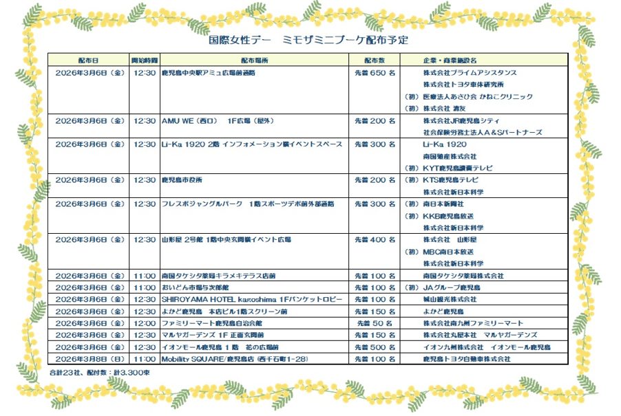 また,県内の企業が県及び鹿児島市と共催で,国際女性デーのシンボルフラワーであるミモザのミニブーケを商業施設等で配布します。